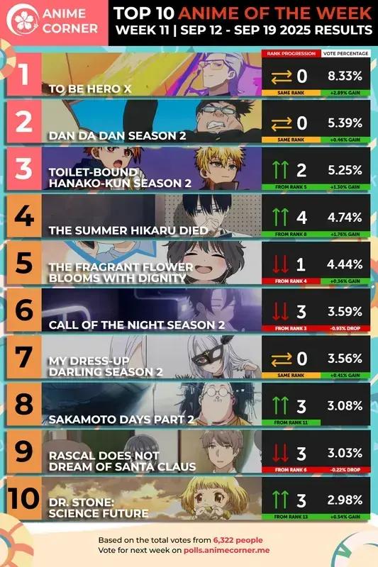 Na 11ª semana da temporada Summer 2025, vários animes conquistaram a preferência dos fãs. A votação semanal mostra quais produções estão em alta. Entre os mais votados, To Be Hero X lidera com popularidade crescente. Em segundo lugar, o aclamado Dan Da Dan mantém sua força, seguido de perto por Oshi no Ko, que impressiona com sua trama envolvente.
