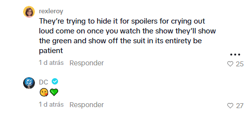 - “Eles estão tentando esconder por causa de spoilers. Assim que você assistir à série, eles vão mostrar o verde e exibir o traje na íntegra. Seja paciente.”